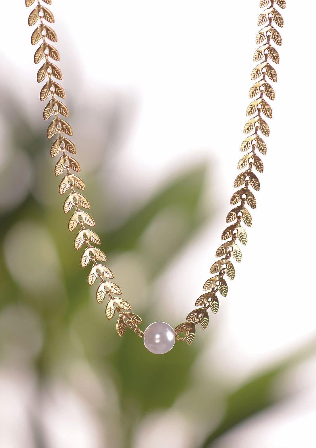 Laurel Leaf Chain Gold Freshwater Pearl Necklace - JJ035